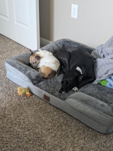 They are currently on the couch in my attempt to train the dogs to staying off my furniture… idk how well that will go but it’s a good sign that out of all the available places they usually lay they have both chosen the new beds.