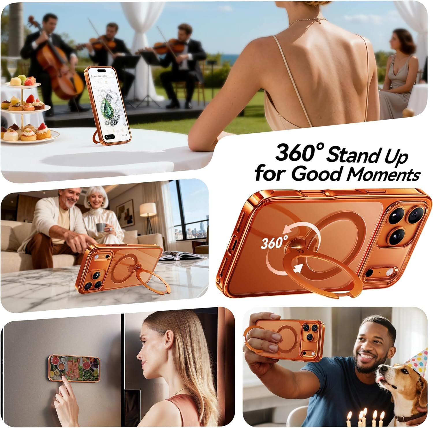 Built-in 360° rotating magnetic stand is what sold me. It's strong, smooth, and works in both portrait and landscape-perfect for watching videos, taking group photos, video calls, or even following recipes while cooking. No more balancing my phone against cups or books!