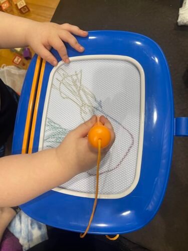 My 19 month old likes to play with this doodle board. The writing pen is little big for her small hands and she needs help with the eraser. Otherwise ...More
