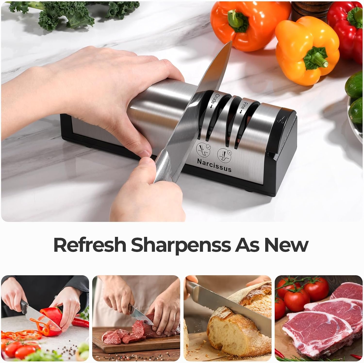 68 reviews for Narcissus Knife Sharpener. Professional 2 Stage Electric Knife Sharpener for Quick Sharpening & Polishing. with Scissors Sharpener and Metal Dust Collection Box. Stainless Steel. Silver